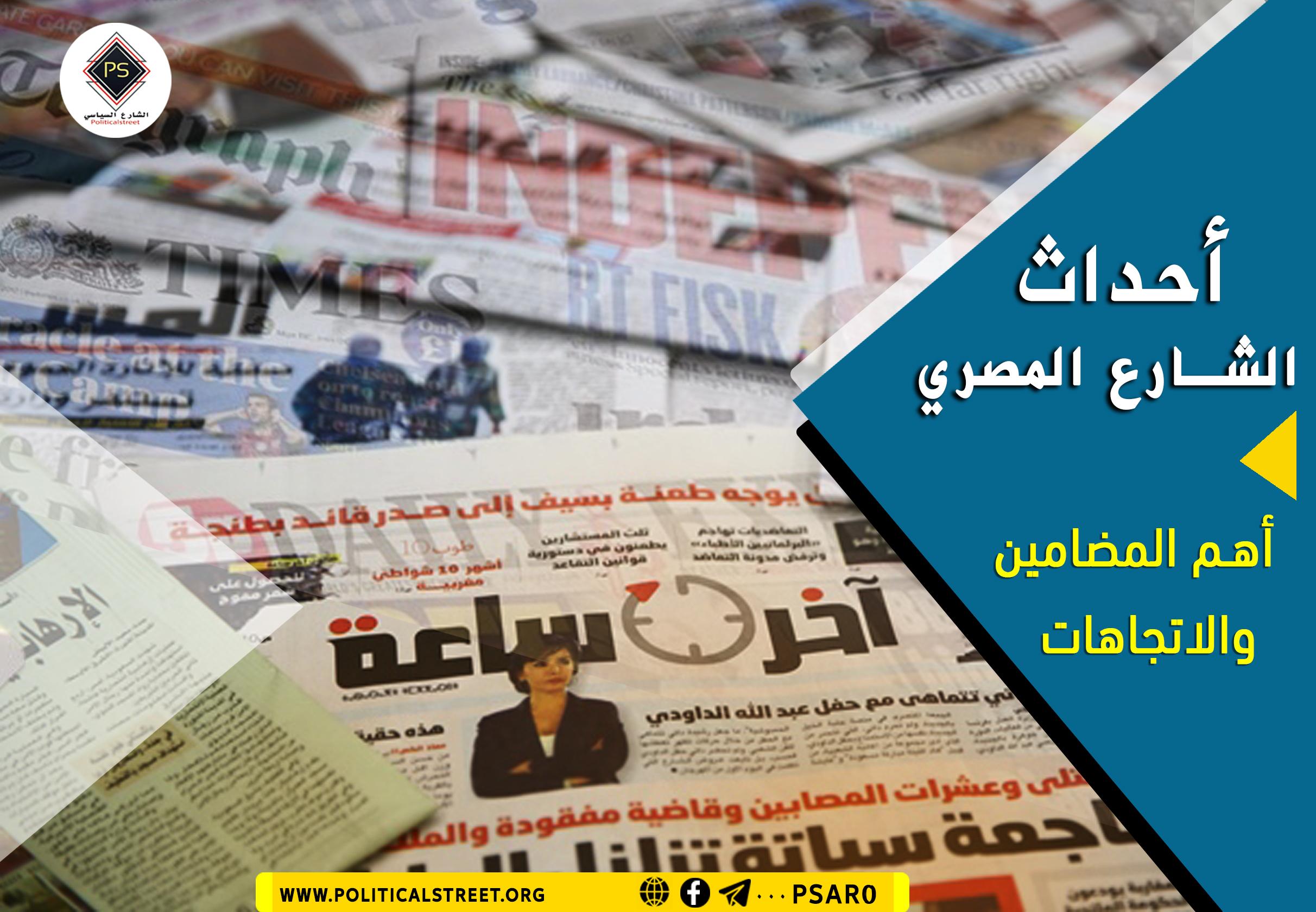 تضمنت أخبار الصحف للداخل المصري عدد من الاتجاهات والمضامين الهامة، حيث اتجهت الأخبار لإبراز الجانب السياسية على المستوى الداخلي والخارجي، فأبرزت على المستوى الخارجي، تصريحات السيسي الموجهة للجيش المصري للإستعداد لتلقي مهام في أي وقت بالحرب خارج حدود البلاد، وتضمنت بذلك مساعي الجنرال السيسي للاتجاه للحل العسكري في القضية الليبية وعدم الموافقة على أي خيار يمكن الجانب التركي من خطوات أخرى داخل ليبيا في اتجاه سرت ومصراته، حتى وإن كان الخيار كالذي طرحته أمريكا، بإنشاء منطقة عازلة في منطقة النزاع.